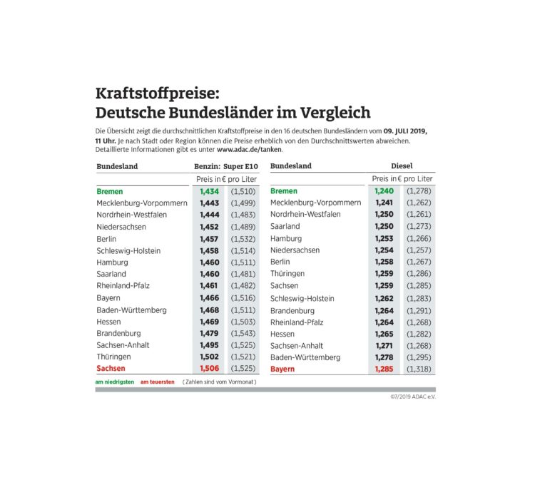 München (ots) Die Durchschnittspreise für Benzin und Diesel in den Bundesländern weisen erkennbare Unterschiede auf. Am günstigsten tanken Autofahrer derzeit im Stadtstaat Bremen: Ein Liter Super E10 ist hier mit durchschnittlich 1,434 Euro um 7,2 Cent billiger als im teuersten Bundesland Sachsen (1,506 Euro). Ein Liter Diesel kostet in Bremen im Mittel 1,240 Euro und damit…