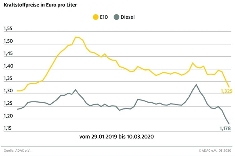München (ots) Die Spritpreise an den Tankstellen geben weiter nach. Dies ist vor allem eine Folge der eingebrochenen Rohölnotierungen. Laut aktueller Auswertung des ADAC kostet ein Liter Super E10 im Bundesmittel 1,325 Euro, das sind 3,1 Cent weniger als in der Vorwoche. Diesel verbilligte sich um 2,4 Cent auf durchschnittlich 1,178 Euro je Liter. Der…