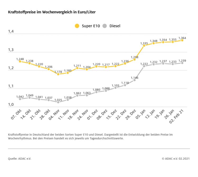 München (ots) Die Kraftstoffpreise an den deutschen Tankstellen sind gegenüber der Vorwoche gestiegen. Wie der ADAC mitteilt, müssen die Autofahrer für einen Liter Diesel derzeit im bundesweiten Mittel 1,239 Euro bezahlen, das sind 0,6 Cent mehr als vor Wochenfrist. Noch etwas stärker verteuerte sich Benzin: So kostet ein Liter Super E10 im Schnitt 1,364 Euro, das…