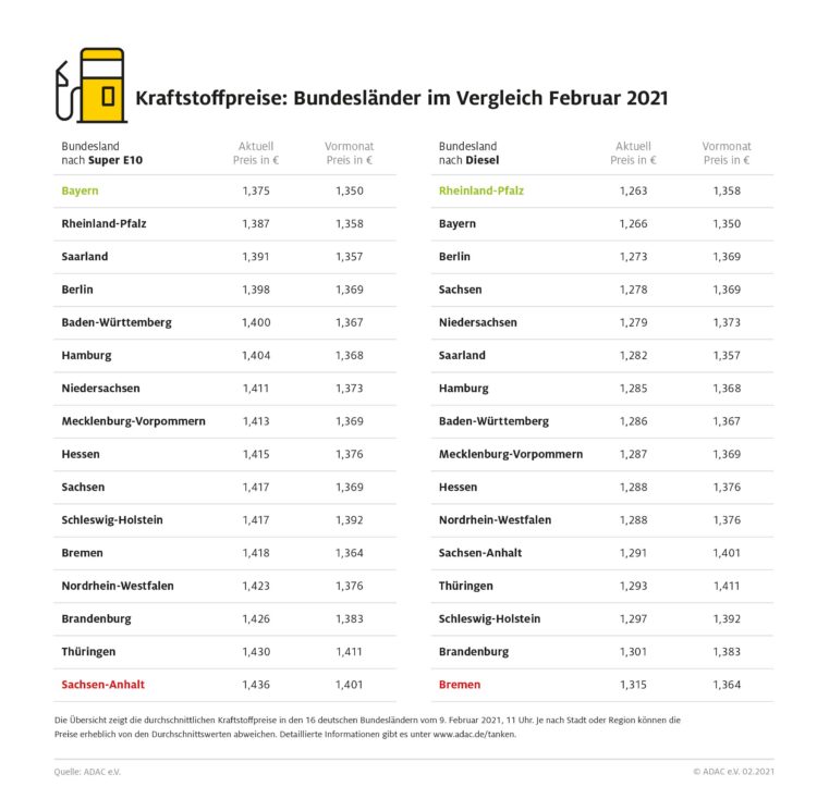 München (ots) Tanken in Bayern und Rheinland-Pfalz am günstigsten In Bayern und Rheinland-Pfalz tanken die Autofahrer bundesweit derzeit am günstigsten. Bayern ist dabei für die Fahrer von Benzin-Pkw das preiswerteste Pflaster: Wie die aktuelle ADAC Auswertung der Kraftstoffpreise in den 16 Bundesländern zeigt, kostet ein Liter Super E10 im Freistaat im Schnitt 1,375 Euro. Rheinland-Pfalz liegt…