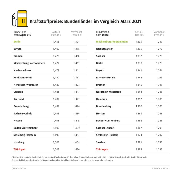 München (ots) Die Autofahrer in Thüringen müssen derzeit beim Tanken am meisten für ihren Kraftstoff bezahlen. Sowohl Benzin als auch Diesel kosten aktuell in keinem anderen Bundesland mehr. Wie die heutige ADAC Auswertung der Kraftstoffpreise in den 16 Bundesländern zeigt, kostet ein Liter Super E10 in Thüringen 1,508 Euro. Für einen Liter Diesel müssen die Thüringer…