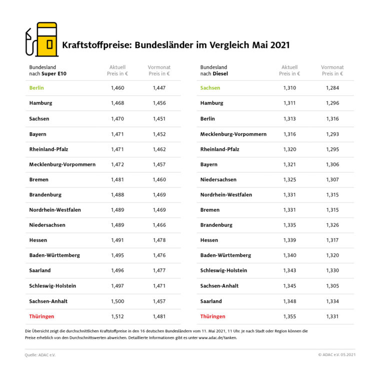 München (ots) – In Thüringen bleibt Sprit weiter teuer. Bereits in der letzten ADAC Auswertung der Kraftstoffpreise in den 16 Bundesländern rangierte Thüringen als teuerstes Bundesland. Auch diesmal hat Thüringen den negativen Spitzenplatz inne. Ein Liter Super E10 kostet hier 1,512 Euro und damit nochmal mehr als im Vormonat (1,481 Euro). Bei Diesel liegt der Literpreis…