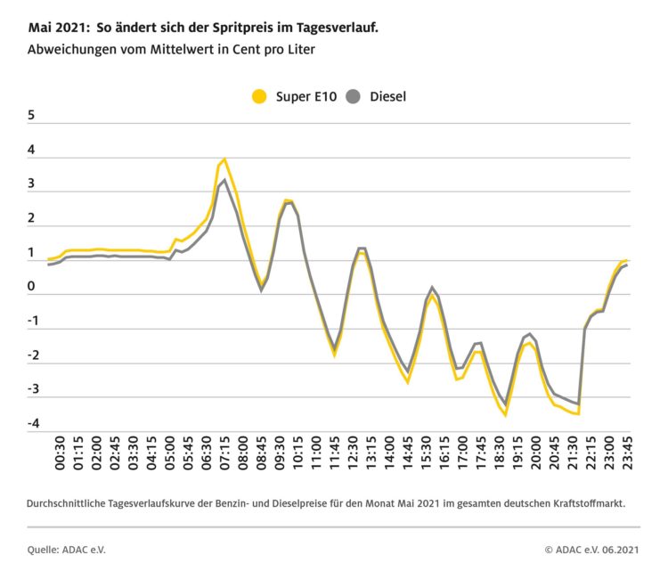 ADAC Auswertung: sieben Preisrunden am Tag – Spanne von sieben Cent zwischen teuerstem und günstigsten Tankzeitpunkt