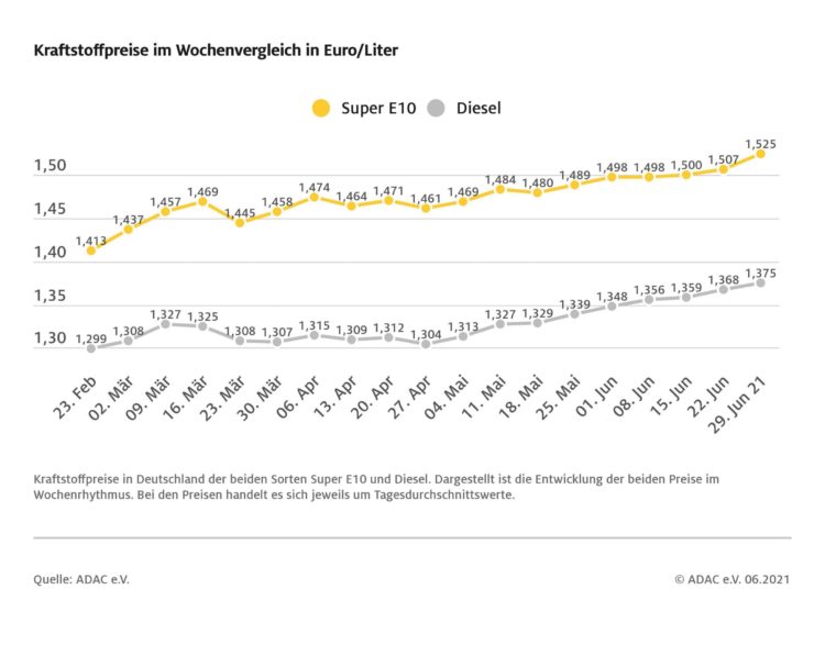 München (ots) – Nach einer aktuellen ADAC Auswertung sind die Kraftstoffpreise in Deutschland erneut angestiegen. Bei Super E10 kletterte der durchschnittliche Literpreis sogar um 1,8 Cent nach oben. Damit kostet ein Liter 1,525 Euro. Bei Diesel fiel der Preissprung etwas moderater aus. Ein Liter kostet im bundesweiten Mittel aktuell 1,375 Euro und damit 0,7 Cent mehr…