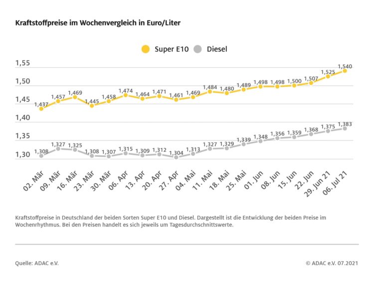München (ots) Der Anstieg der Kraftstoffpreise hat sich auch in dieser Woche fortgesetzt. Ein Liter Super E10 kostet inzwischen 1,540 Euro, ein Liter Diesel 1,383 Euro. Dies zeigt die aktuelle ADAC Auswertung der Kraftstoffpreise in Deutschland. Damit ist der Benzinpreis binnen Wochenfrist um 1,5 Cent gestiegen, Diesel hat sich um 0,8 Cent verteuert. Der Dieselpreis ist…