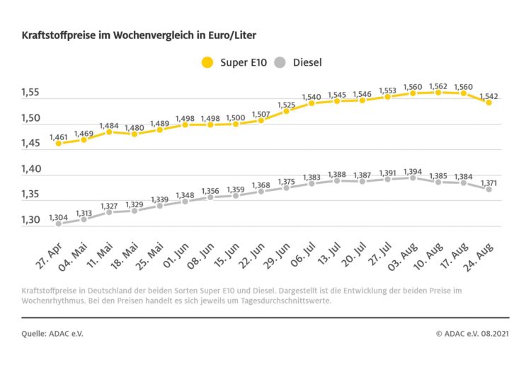 München (ots) – Nach wochenlanger Stagnation auf sehr hohem Niveau hat der Rückgang der Kraftstoffpreise eingesetzt. Wie der ADAC mitteilt, ist der Preis für einen Liter Super E10 binnen Wochenfrist im bundesweiten Mittel um 1,8 Cent auf 1,542 Euro gesunken. Der Preis für Diesel-Kraftstoff ging um 1,3 Cent zurück und liegt derzeit bei 1,371 Euro.…