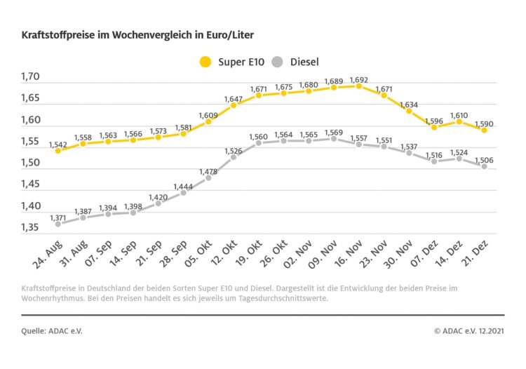 Tanken vor Weihnachten günstiger – Benzinpreis sinkt um zwei Cent, Diesel um 1,8 Cent Günstige Abendstunden nutzen