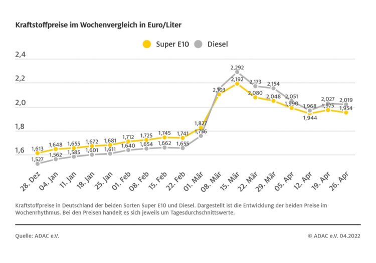 München (ots) – Auch wenn die Kraftstoffpreise in Deutschland im Vergleich zur vergangenen Woche etwas gesunken sind, liegen sie nach wie vor angesichts der Rohölnotierungen auf einem hohen Niveau. Wie die aktuelle ADAC Auswertung zeigt, kostet ein Liter Super E10 im bundesweiten Mittel 1,954 Euro, das sind 2,1 Cent weniger als in der Vorwoche. Diesel ist…