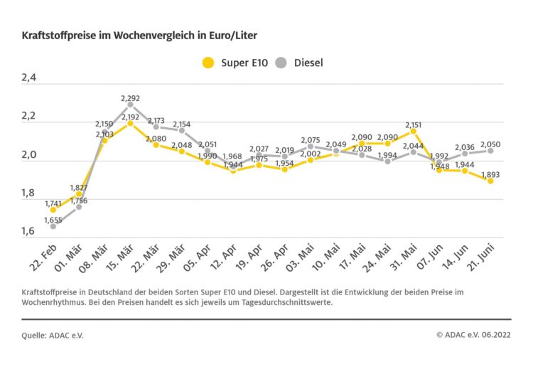 München (ots) – Während der Benzinpreis abschmilzt, ist Diesel erneut teurer geworden. Dies zeigt die wöchentliche ADAC Auswertung der Kraftstoffpreise in Deutschland. So kostet aktuell im bundesweiten Mittel ein Liter Super E10 1,893 Euro. Gegenüber der Vorwoche ist dies ein Minus von 5,1 Cent. Dieselfahrer müssen hingegen im Vergleich zur Vorwoche mehr für ihre Tankfüllung bezahlen.…