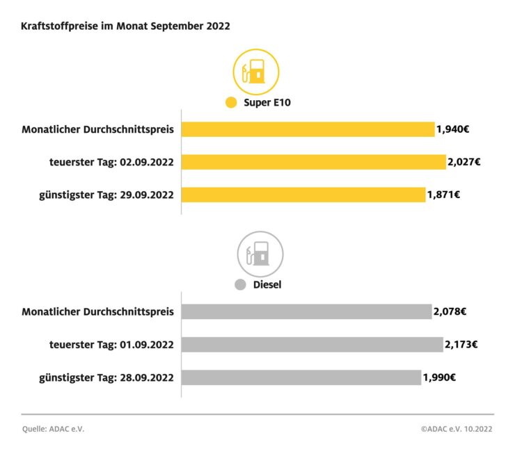 München (ots) Kraftstoffpreise im September 2022 Quelle: ADAC e.V. Die Rückkehr zur regulären Energiesteuer nach dem Ende des Tankrabatts hat den Autofahrern im September deutlich höhere Kraftstoffpreise beschert. Wie die monatliche ADAC Auswertung der Kraftstoffpreise zeigt, kostete ein Liter Super E10 im Monatsmittel 1,940 Euro. Gegenüber dem August bedeutet dies eine Verteuerung von 21,1 Cent…