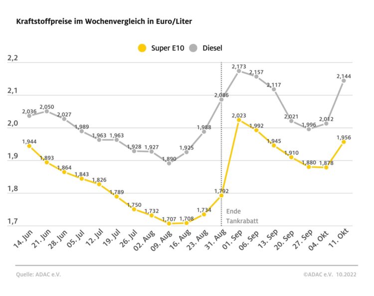 München (ots) – Die Entscheidung der Opec+-Staaten zur Reduzierung der Ölfördermenge am 5. Oktober hat eine Wende bei der Entwicklung der zuletzt sinkenden Kraftstoffpreise eingeläutet. Binnen einer Woche stieg der durchschnittliche Preis für einen Liter Diesel in Deutschland laut aktueller ADAC Auswertung um 13,2 Cent auf 2,144 Euro. E10 verteuerte sich im gleichen Zeitraum um rund…