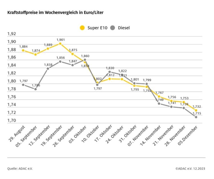 München (ots) Der Preis für Rohöl sackt weiter ab – und die Spritpreise folgen ihm, wenngleich noch nicht in ausreichendem Umfang. Wie die aktuelle ADAC Auswertung der Kraftstoffpreise in Deutschland zeigt, ist der Preis für einen Liter Super E10 gegenüber der Vorwoche um 2,1 Cent auf aktuell 1,732 Euro gesunken. Um 2,3 Cent hat sich Diesel-Kraftstoff…