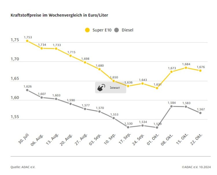 München (ots) Die Preise für Super E10 und Diesel sind etwas gesunken. Gegenüber der Vorwoche zeigt die aktuelle ADAC Auswertung der Kraftstoffpreise von mehr als 14.000 Tankstellen in Deutschland einen Rückgang von 0,8 Cent pro Liter bei Super E10 und von 1,6 Cent bei Diesel. Im Durchschnitt kostete am 22. Oktober ein Liter Benzin 1,676 Euro,…