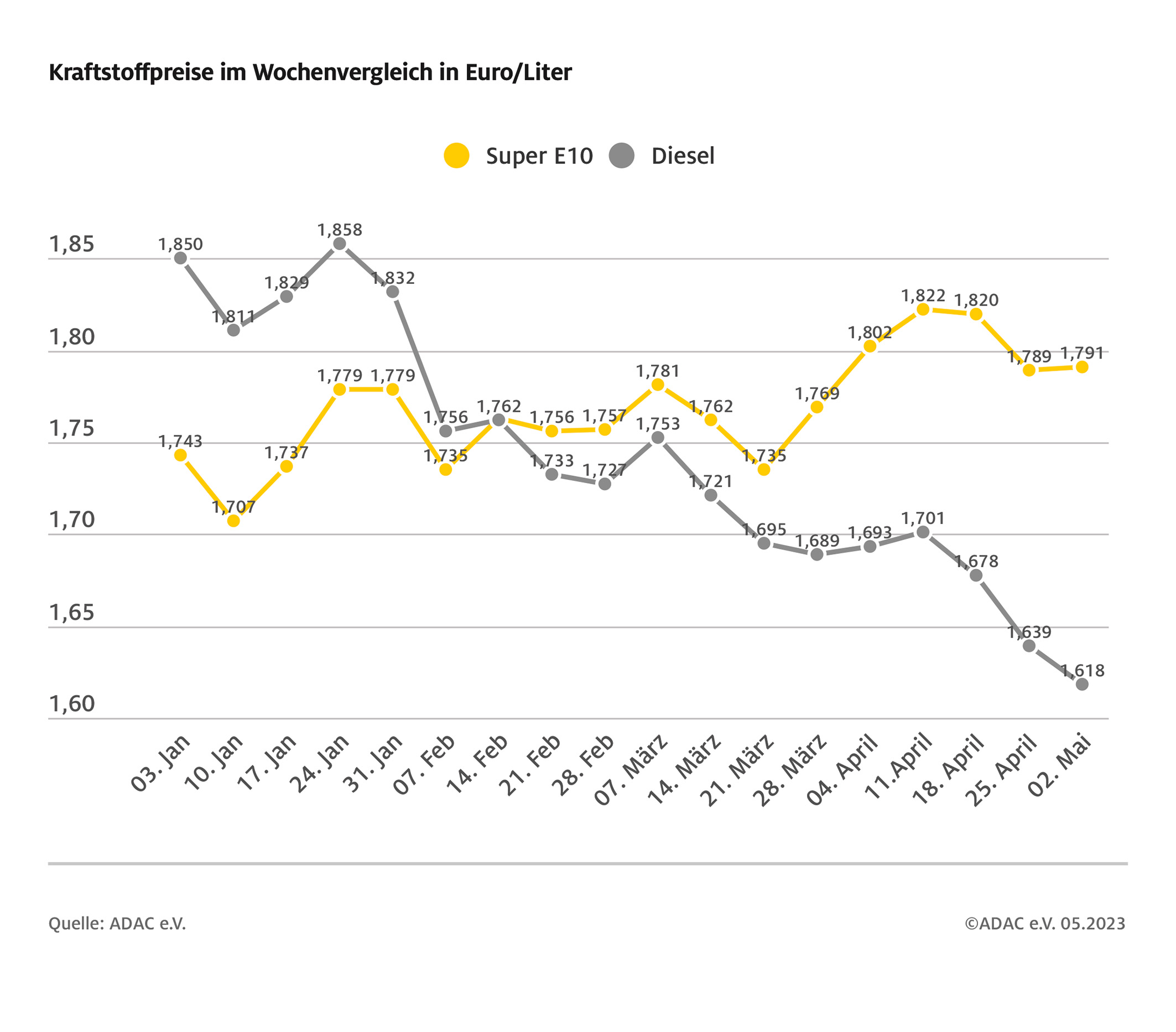 München (ots) – Die Differenz zwischen Benzin- und Dieselpreis hat sich erneut vergrößert und beträgt jetzt 17,3 Cent. Gründe für die Ausweitung des Preisunterschieds sind die leichte Verteuerung bei Benzin und der Rückgang des Dieselpreises. Laut aktueller ADAC Auswertung der Kraftstoffpreise in Deutschland kostet ein Liter Super E10 im bundesweiten Mittel 1,791 Euro und damit 0,2 Cent mehr als in der Vorwoche. Diesel ist im Wochenvergleich hingegen um 2,1 Cent günstiger und kostet aktuell 1,618 Euro.