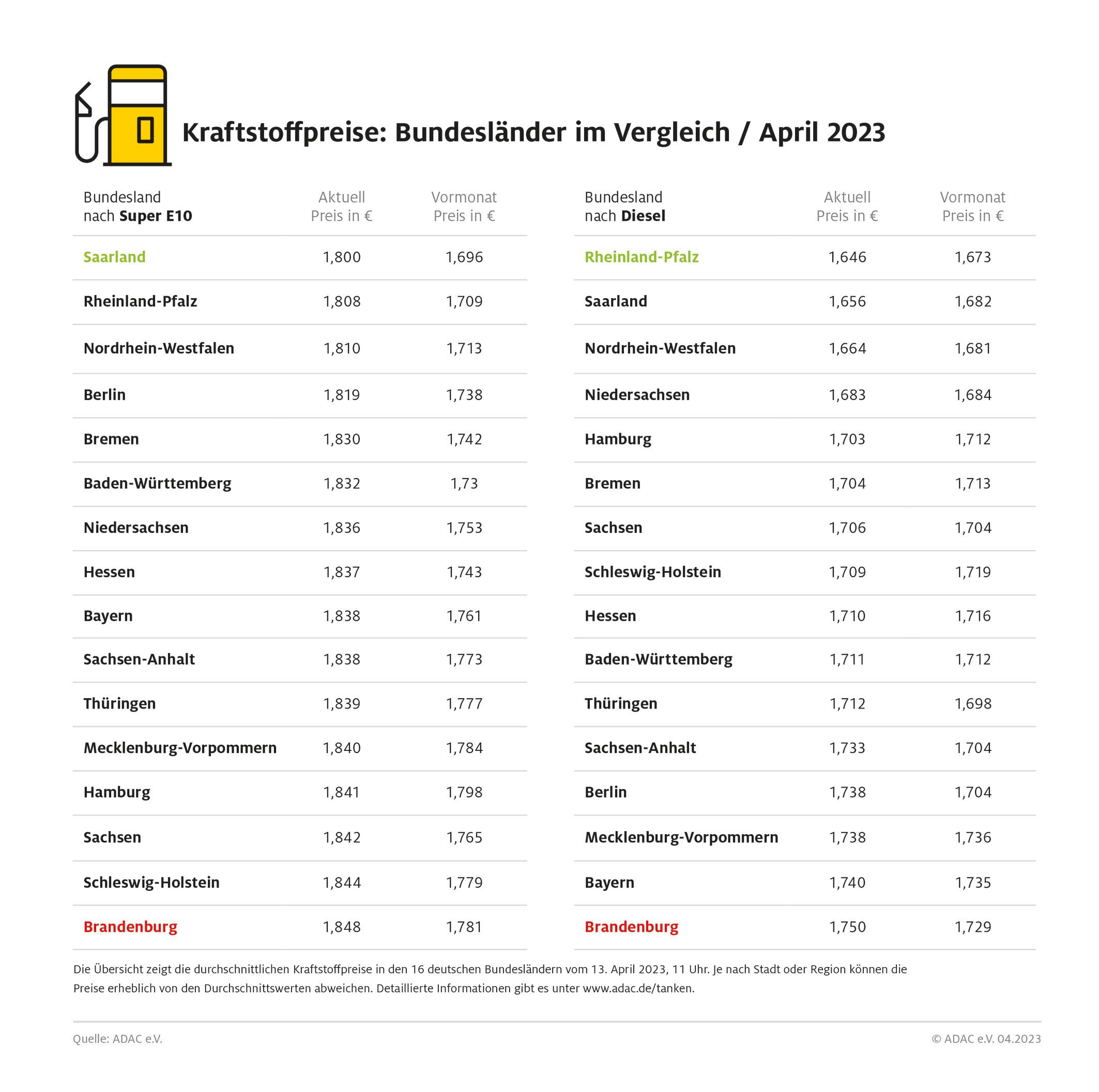 Laut ADAC sind aktuelle regionale Preisschwankungen immer wieder zu beobachten. Auffällig ist jedoch die größere regionale Preisspreizung bei Diesel als bei Benzin. Während die Differenz zwischen dem teuersten und dem günstigsten Bundesland bei Benzin 4,8 Cent beträgt, ist sie bei Diesel mit 10,4 Cent mehr als doppelt so groß. Auch die Preisdifferenz zwischen Benzin und Diesel in den einzelnen Bundesländern unterscheidet sich stark. So kostet Diesel in Rheinland-Pfalz 16,2 Cent weniger als Super E10, während sich in Berlin die Preise beider Sorten nur um 8,1 Cent unterscheiden.
