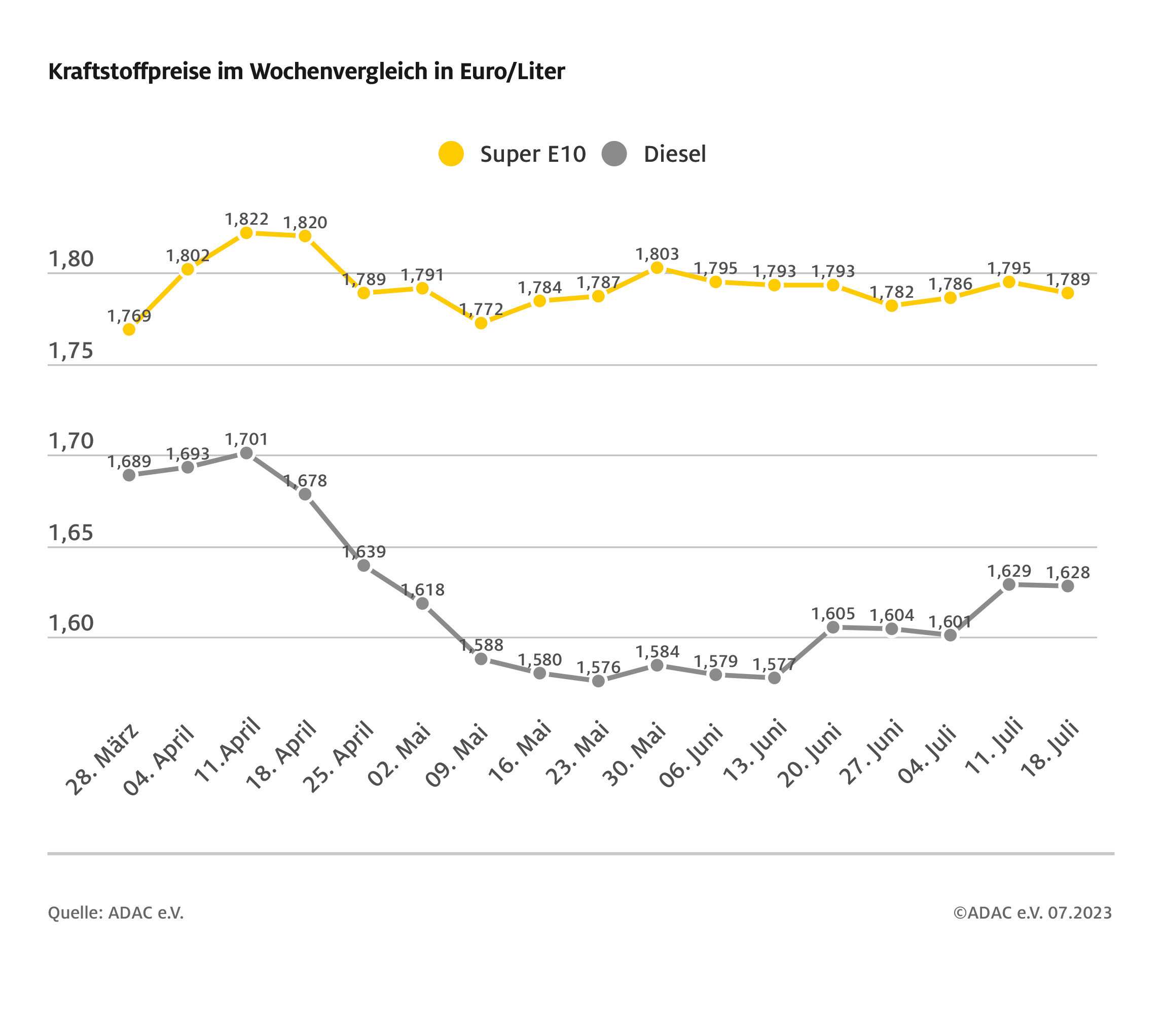 München (ots) – Die Kraftstoffpreise an den deutschen Tankstellen bewegen sich weiterhin kaum von der Stelle. Vor allem der Tagesdurchschnittspreis für Super E10 ist seit Wochen relativ stabil und pendelt dabei knapp unterhalb der Marke von 1,80 Euro. Laut aktueller ADAC Auswertung der Kraftstoffpreise in Deutschland kostet ein Liter Super E10 im bundesweiten Mittel 1,789 Euro, das sind 0,6 Cent weniger als vor Wochenfrist.