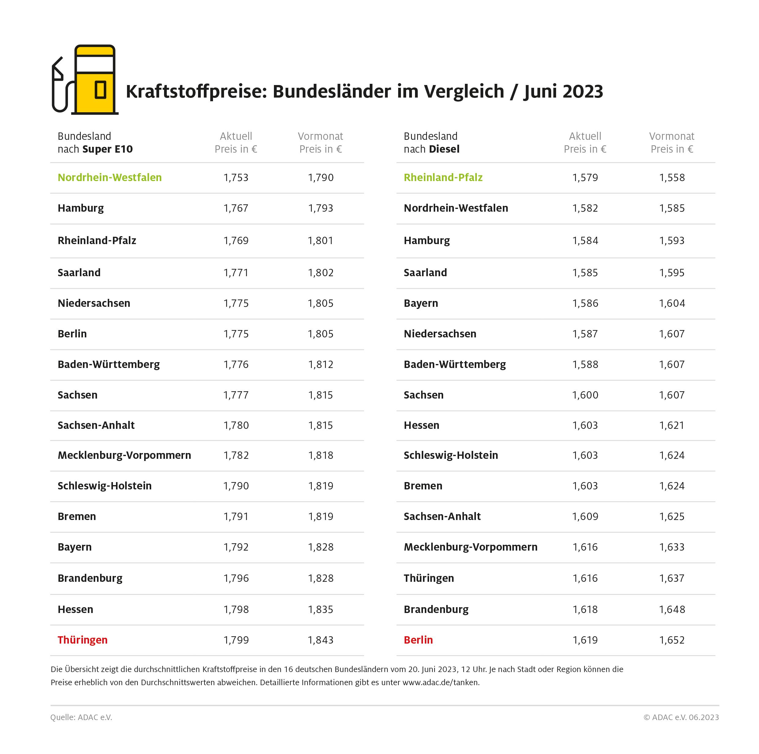 München (ots) – Die regionalen Preisunterschiede zwischen den Kraftstoffpreisen innerhalb Deutschlands haben sich erneut verringert. Wie die aktuelle ADAC Auswertung der Kraftstoffpreise in den 16 deutschen Bundesländern zeigt, kostet ein Liter Super E10 im bevölkerungsreichsten Bundesland Nordrhein-Westfalen mit durchschnittlich 1,753 Euro bundesweit am wenigsten. Am teuersten ist Super E10 derzeit in Thüringen mit 1,799 Euro.