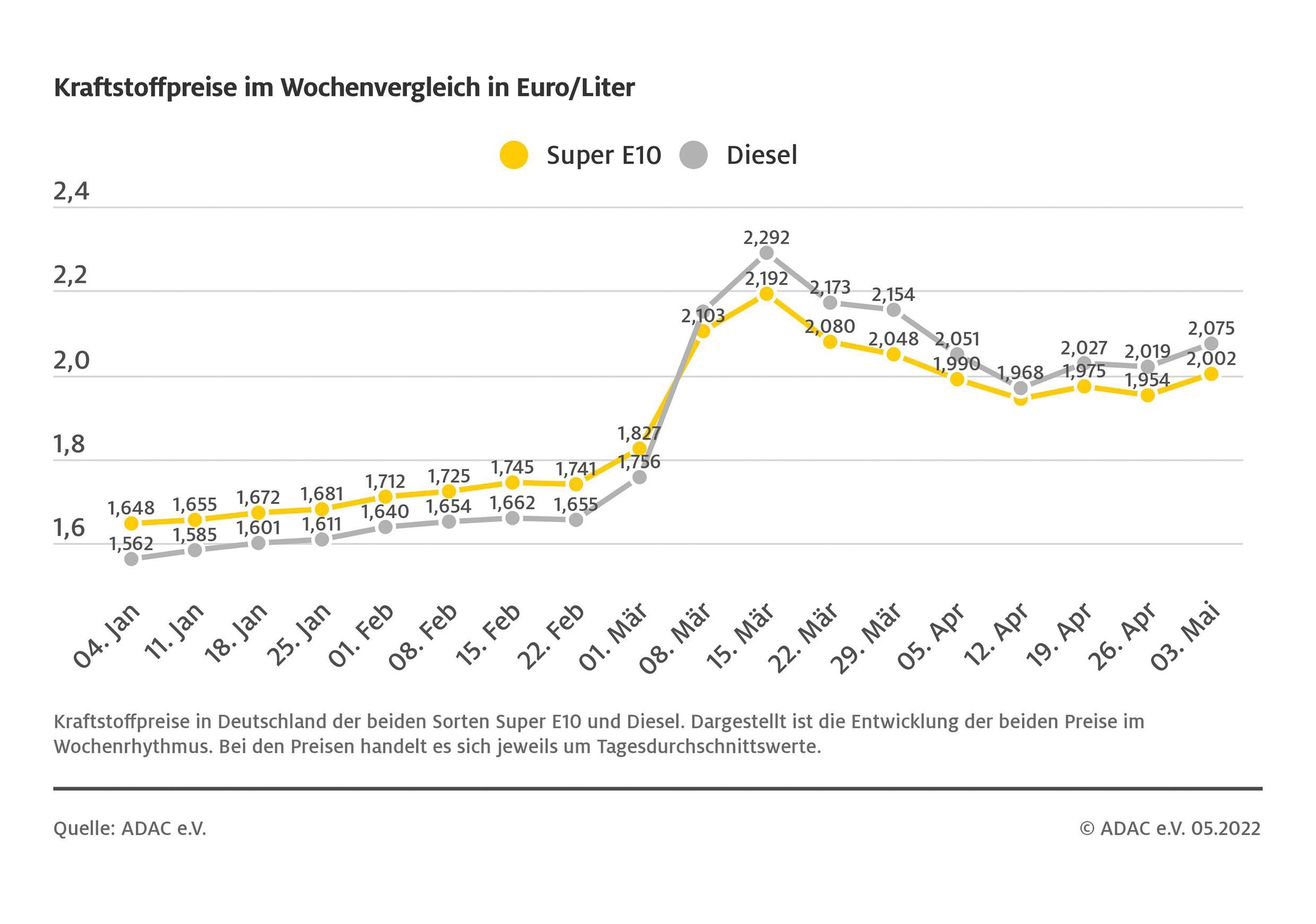 München (ots) – Die Fahrt zur Tankstelle ist binnen einer Woche wieder deutlich teurer geworden. Der Preis für einen Liter Super E10 ist im Vergleich zur Vorwoche um 4,8 Cent gestiegen und liegt aktuell im bundesweiten Mittel bei 2,002 Euro. Dies zeigt die aktuelle ADAC Auswertung der Kraftstoffpreise in Deutschland. Seit Anfang April bis Anfang Mai hatte Super E10 stets weniger als zwei Euro je Liter gekostet. Noch stärker ist der Preis für Dieselkraftstoff gestiegen. Für einen Liter müssen die Autofahrer derzeit im Schnitt 2,075 Euro bezahlen – ein Anstieg von 5,6 Cent.