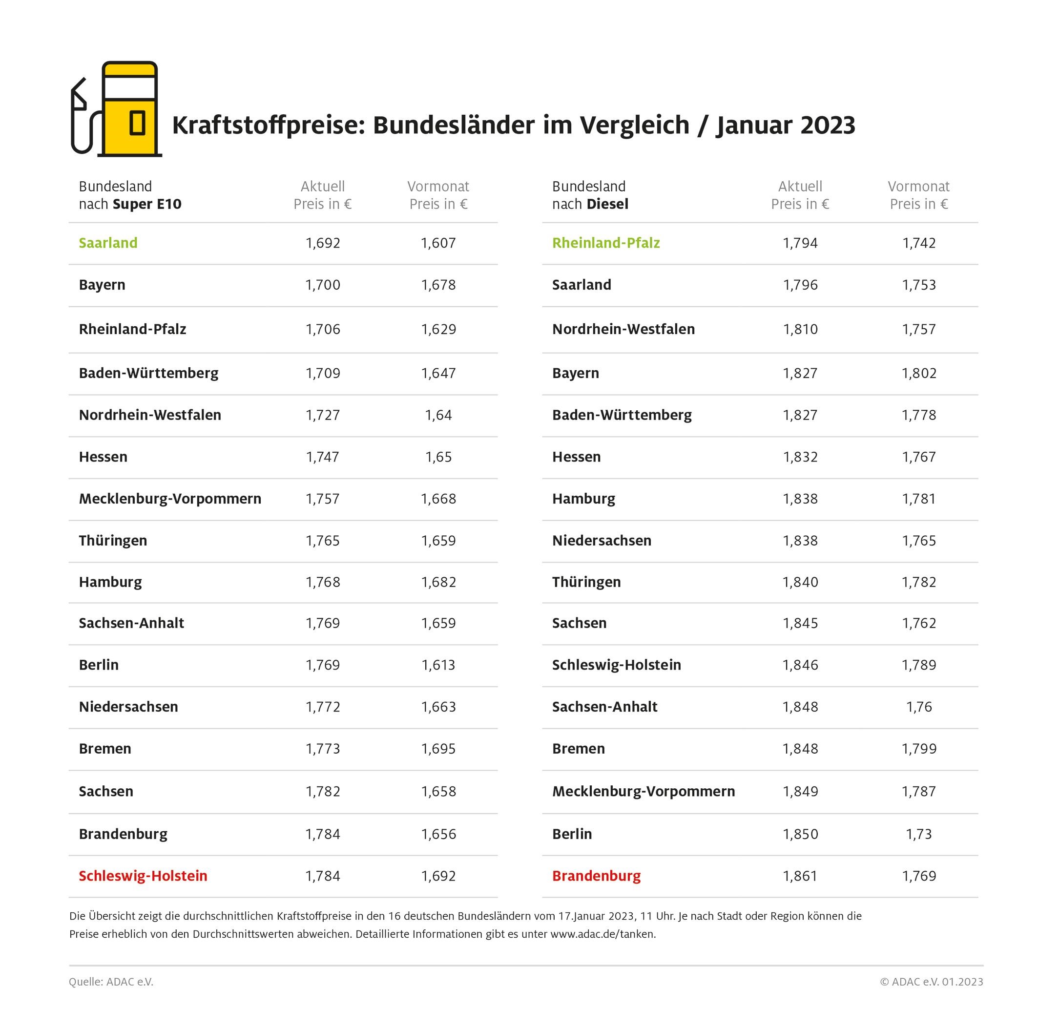 München (ots) – Noch im Spätsommer und Herbst 2022 hat der ADAC in seinem Vergleich der Kraftstoffpreise in den deutschen Bundesländern regionale Preisdifferenzen von rund 17 Cent festgestellt. Dies scheint der Vergangenheit anzugehören – die Preisunterschiede sind wieder auf ein weitaus geringeres Maß geschrumpft aber immer noch erheblich. Wie die aktuelle Auswertung in den 16 Bundesländern zeigt, tanken die Autofahrer im Saarland und in Rheinland-Pfalz am günstigsten, in Schleswig-Holstein und in Brandenburg ist Kraftstoff derzeit am teuersten.