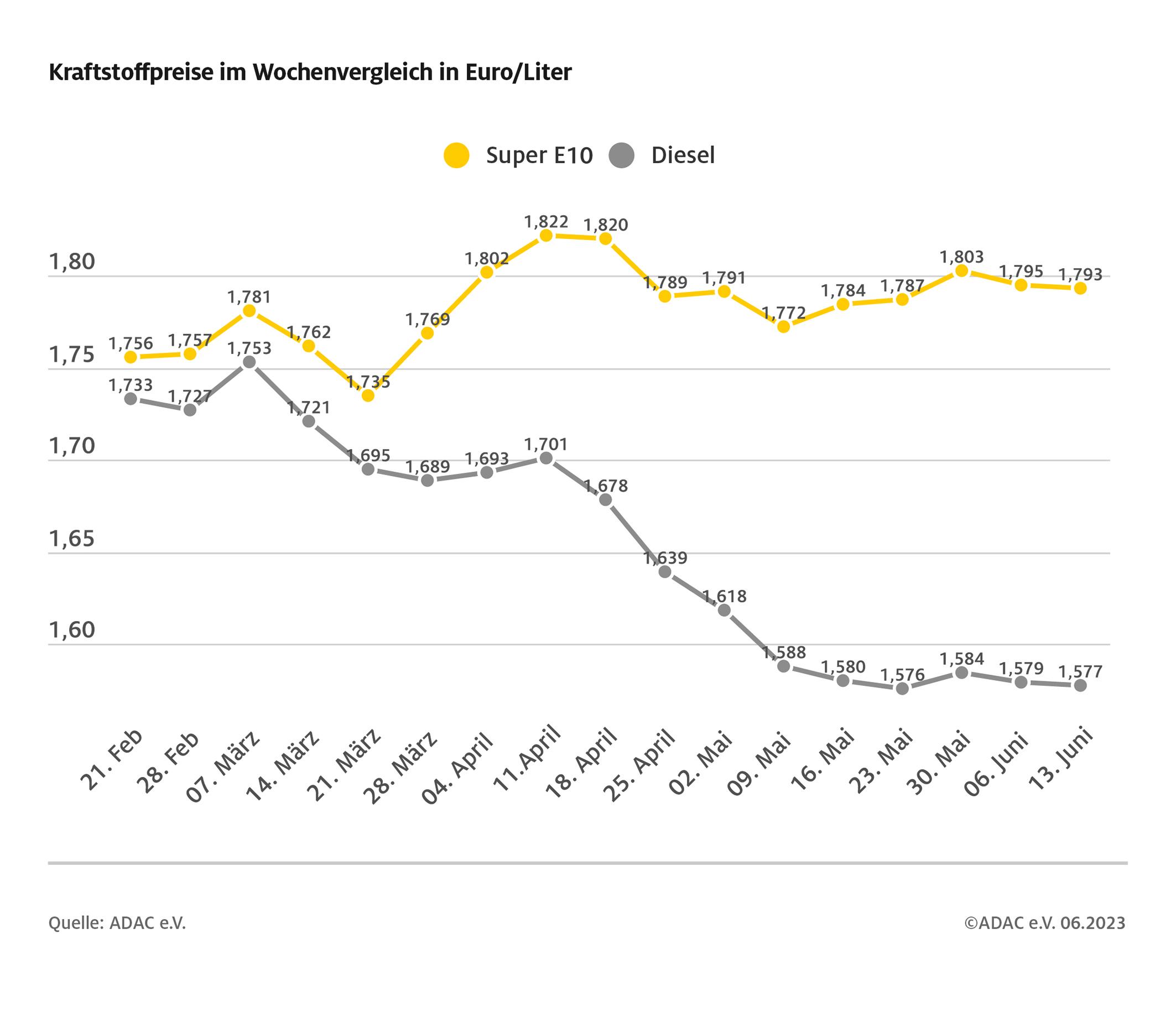 München (ots) – Die Preise an den Zapfsäulen in Deutschland sind im Vergleich zur vergangenen Woche leicht gesunken. Laut aktueller ADAC Auswertung der Kraftstoffpreise kostet ein Liter Super E10 im bundesweiten Mittel 1,793 Euro, das sind 0,2 Cent weniger als in der Vorwoche. Diesel ist ebenfalls um 0,2 Cent billiger und kostet aktuell 1,577 Euro.