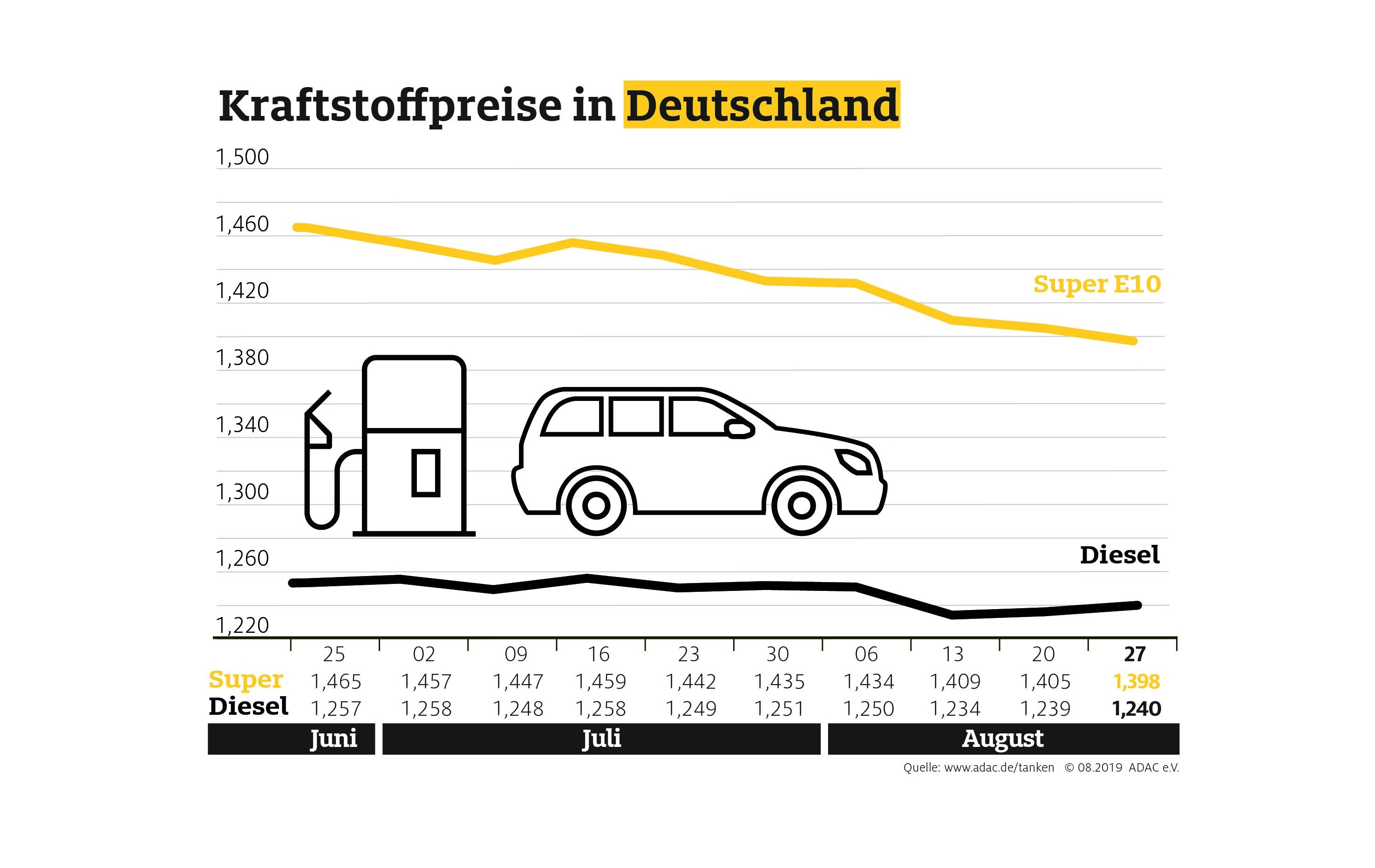 Der leichte Rückgang der Benzinpreise setzt sich fort. Laut aktueller Auswertung des ADAC müssen Autofahrer derzeit für einen Liter Super E10 im Bundesdurchschnitt 1,398 Euro bezahlen, das sind 0,7 Cent weniger als in der Vorwoche. Diesel hingegen verteuerte sich geringfügig. Ein Liter kostet im Mittel 1,240 Euro, ein Anstieg um 0,1 Cent.