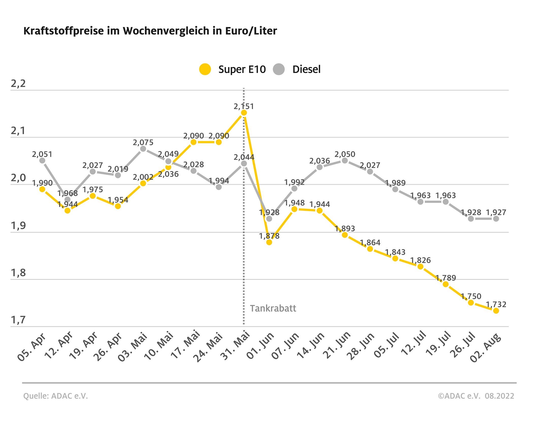 Die Kraftstoffpreise sind aus Sicht des ADAC im Vergleich zum Rohölpreis weiter viel zu hoch, das Potenzial für Preissenkungen ist erheblich und kann durch verstärkten Wettbewerb genutzt werden. Der Tankrabatt, bei dem die Energiesteuer zusammen mit der anteiligen Mehrwertsteuer am 1. Juni bei Benzin um 35 Cent je Liter, bei Diesel um 17 Cent gesenkt wurde, läuft in vier Wochen aus. Danach wird die Steuer wieder in gewohntem Umfang erhoben mit der Folge, dass die Kraftstoffpreise wieder mehr als zwei Euro kosten dürften.