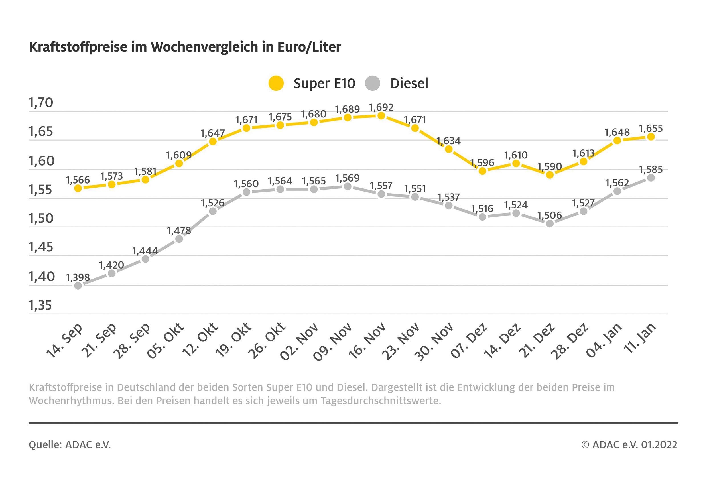 Teurer geworden ist auch Benzin. Der Preis für einen Liter Super E10 liegt derzeit bei 1,655 Euro. Gegenüber der Vorwoche verzeichnet der ADAC damit einen Anstieg um 0,7 Cent. Die Preisdifferenz zwischen den beiden Sorten ist abermals geschrumpft und beträgt aktuell nur noch sieben Cent. Der geringe Abstand ist saisonbedingt aufgrund der starken Heizölnachfrage nicht außergewöhnlich, belastet aber die Dieselfahrer zusätzlich. Rein von der Abgabenseite her müsste der Unterschied rund 20 Cent betragen.