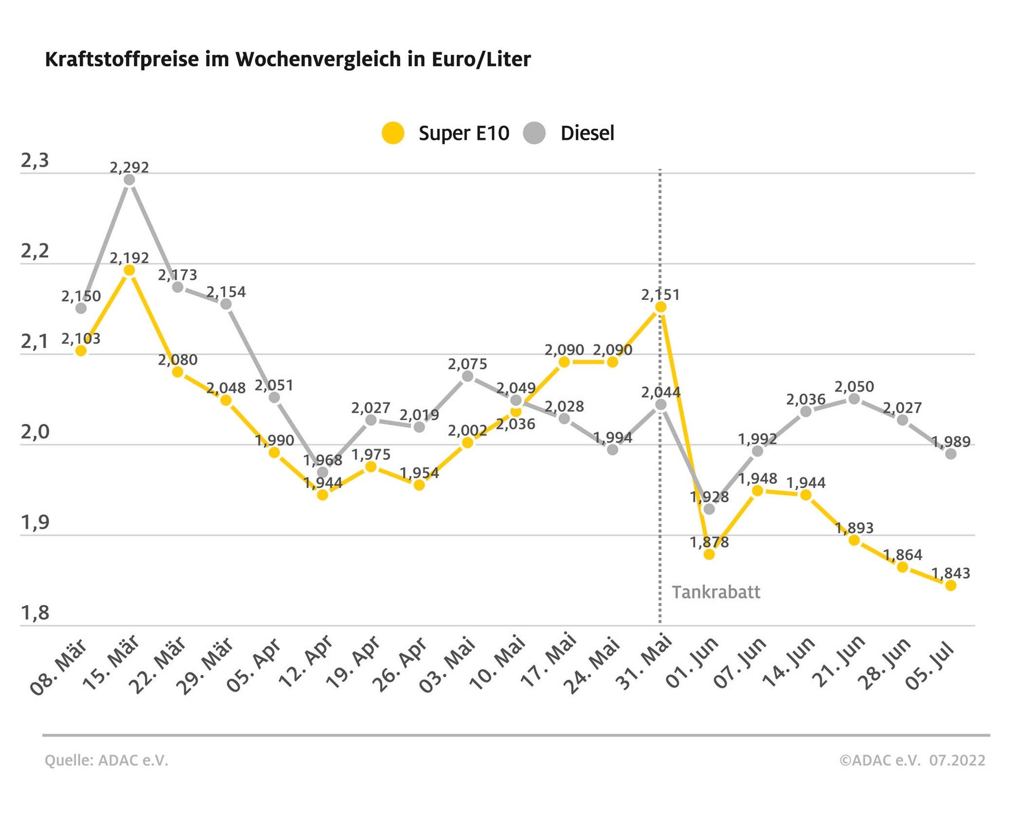 München (ots) – Die Kraftstoffpreise in Deutschland haben im Vergleich zur vergangenen Woche zum Teil spürbar nachgegeben. Vor allem für die Fahrer von Diesel-Pkw hat sich die Situation etwas entspannt – jedoch auf immer noch sehr hohem Niveau. Für einen Liter Diesel muss man derzeit laut aktueller ADAC Auswertung im bundesweiten Schnitt 1,989 Euro bezahlen und damit 3,8 Cent weniger als in der Vorwoche. Der Preis für einen Liter Super E10 ist um 2,1 Cent gesunken und liegt jetzt bei 1,843 Euro.