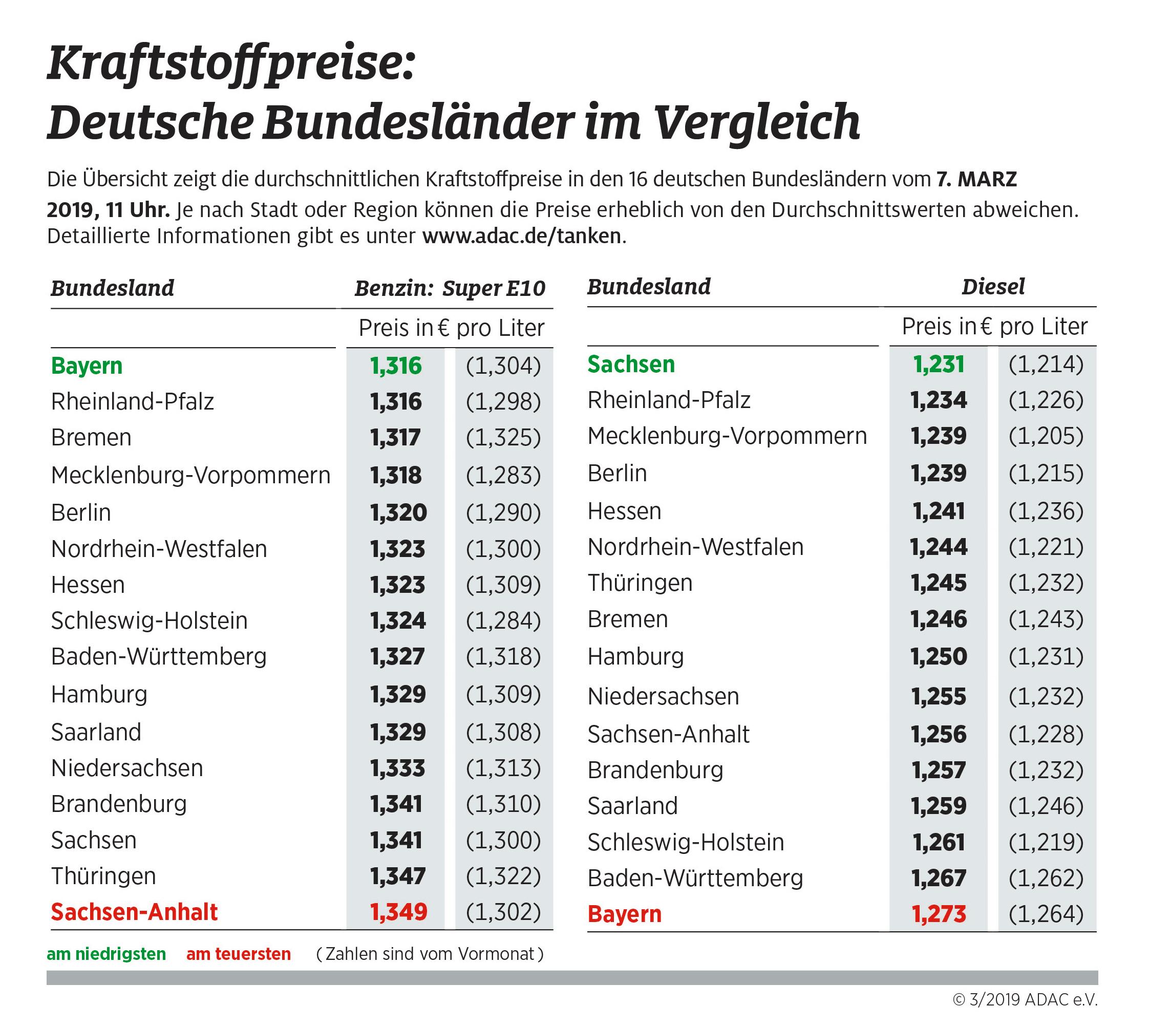 Die Durchschnittspreise für Benzin und Diesel in den Bundesländern nähern sich an. Während Autofahrer in Sachsen-Anhalt für einen Liter Super E10 im Landesschnitt 1,349 Euro bezahlen müssen, kostet dieselbe Menge in Bayern und Rheinland-Pfalz im Mittel nur 1,316 Euro und damit 3,3 Cent weniger. Etwas größer ist die Differenz bei Diesel: Hier liegt der Literpreis in Sachsen mit durchschnittlich 1,231 Euro um 4,2 Cent unter dem teuersten Bundesland Bayern (1,273 Euro). Im Dezember 2018 lag die Differenz zwischen billigstem und teuerstem Bundesland bei beiden Sorten noch bei mehr als 14 Cent.