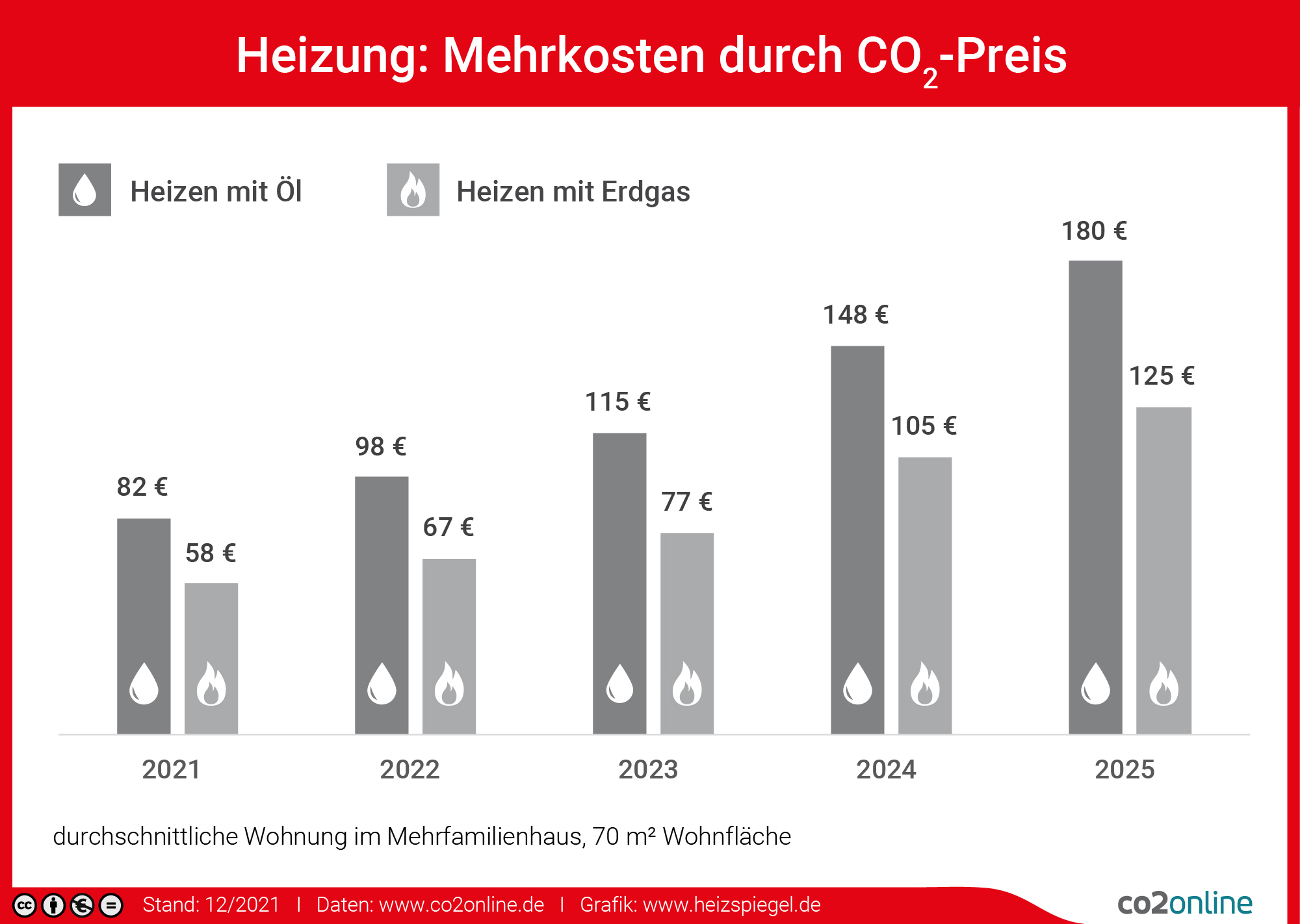 • Bis zum Jahr 2025 steigt der CO2-Preis jährlich um weitere 5 bis 10 Euro je Tonne. Die durchschnittlichen Mehrkosten liegen dann für eine gasbeheizte Wohnung bei 125 Euro, für eine ölbeheizte Wohnung bei 180 Euro pro Jahr.