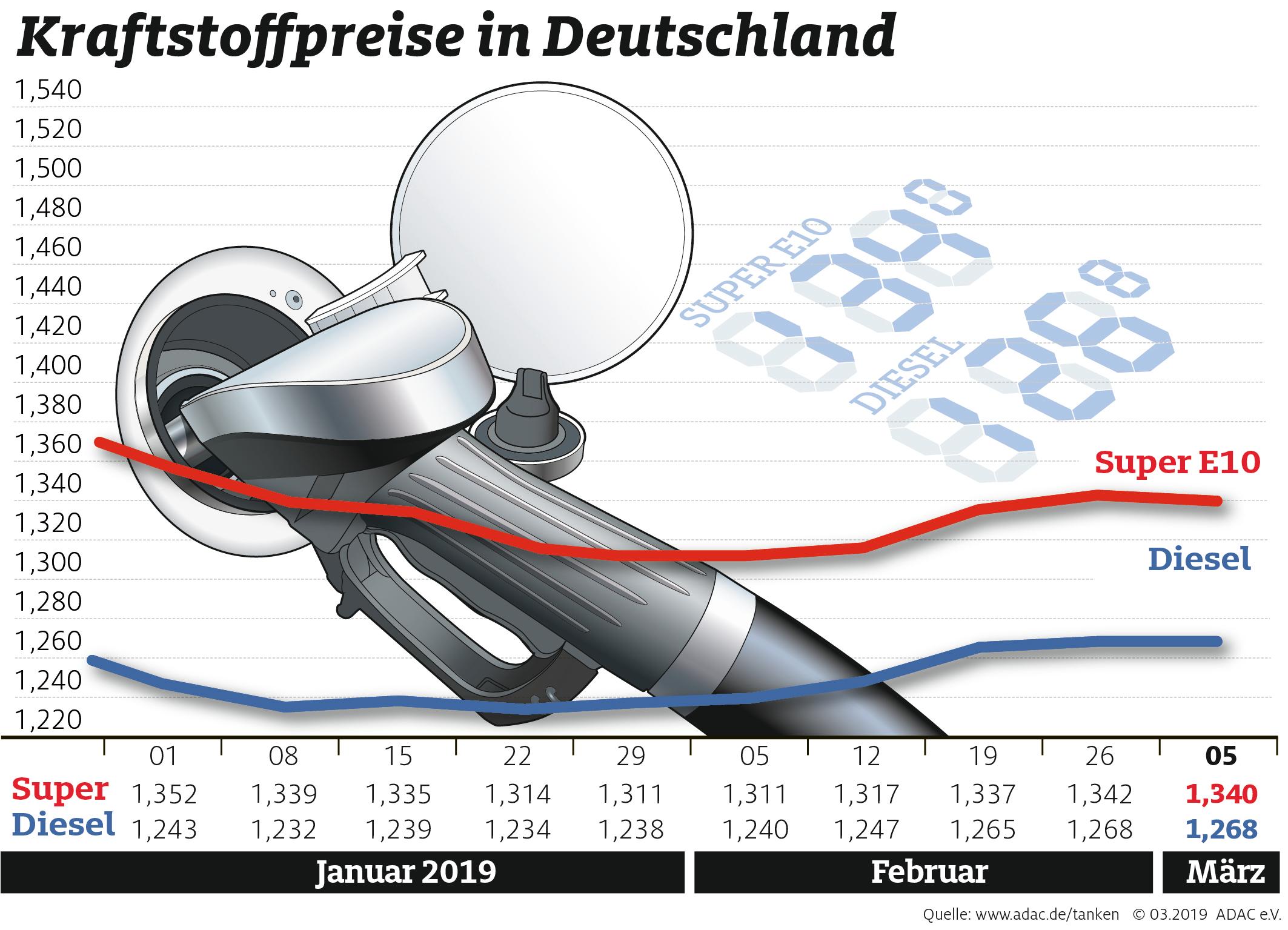 Autofahrer müssen an den Tankstellen fast genauso viel bezahlen wie in der vergangenen Woche. Laut aktueller Auswertung des ADAC verbilligte sich ein Liter Super E10 im Bundesmittel um 0,2 Cent auf 1,340 Euro. Unverändert blieb der Durchschnittspreis für einen Liter Diesel mit 1,268 Euro.