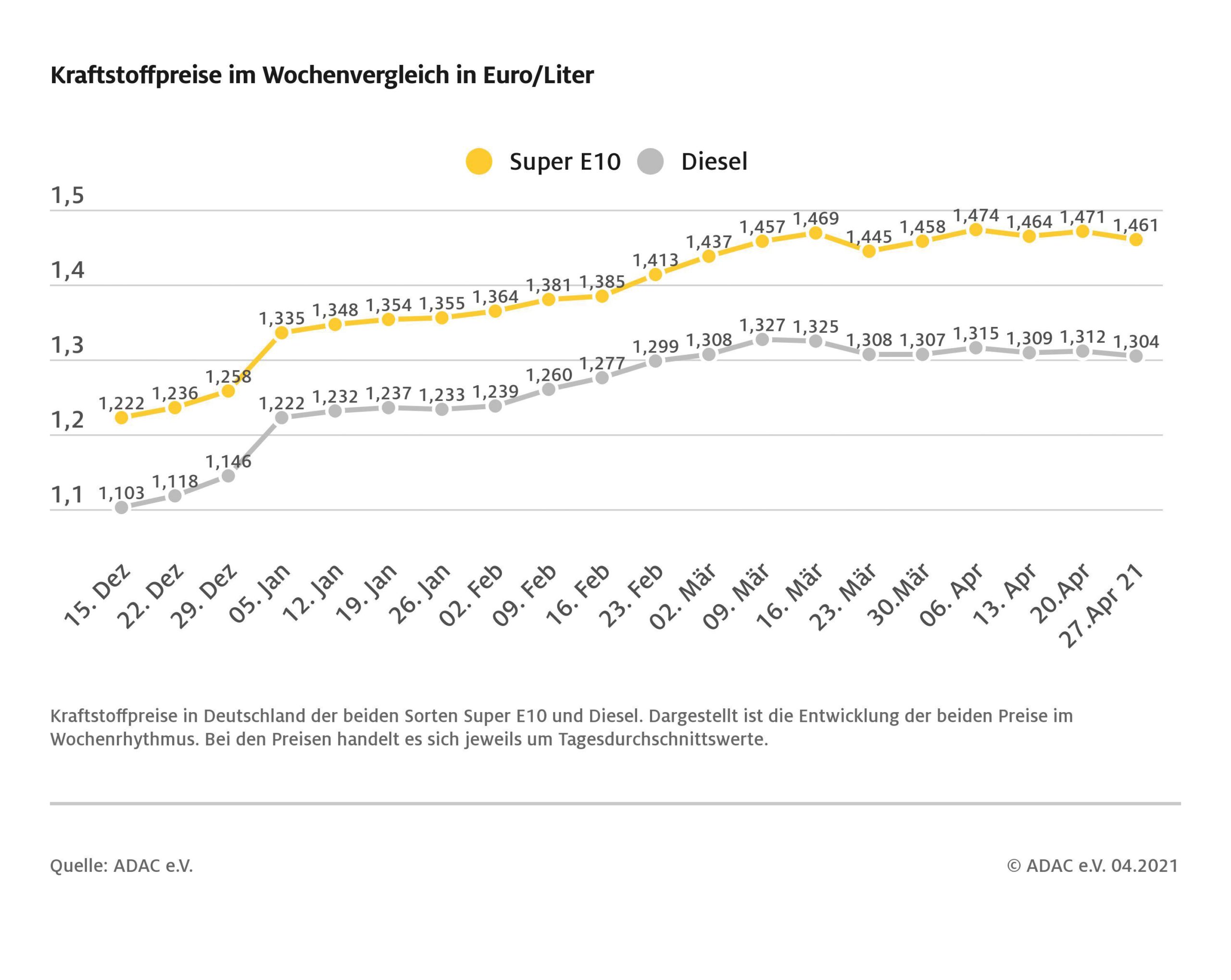Autofahrer müssen derzeit etwas weniger an den Zapfsäulen bezahlen als noch vor einer Woche. Die vom ADAC ermittelten Durchschnittspreise notieren bei einem Liter Super E10 1,0 Cent, bei Diesel 0,8 Cent niedriger. Der Liter Super E10 kostet damit 1,461 Euro, Diesel 1,304 Euro im bundesweiten Schnitt.