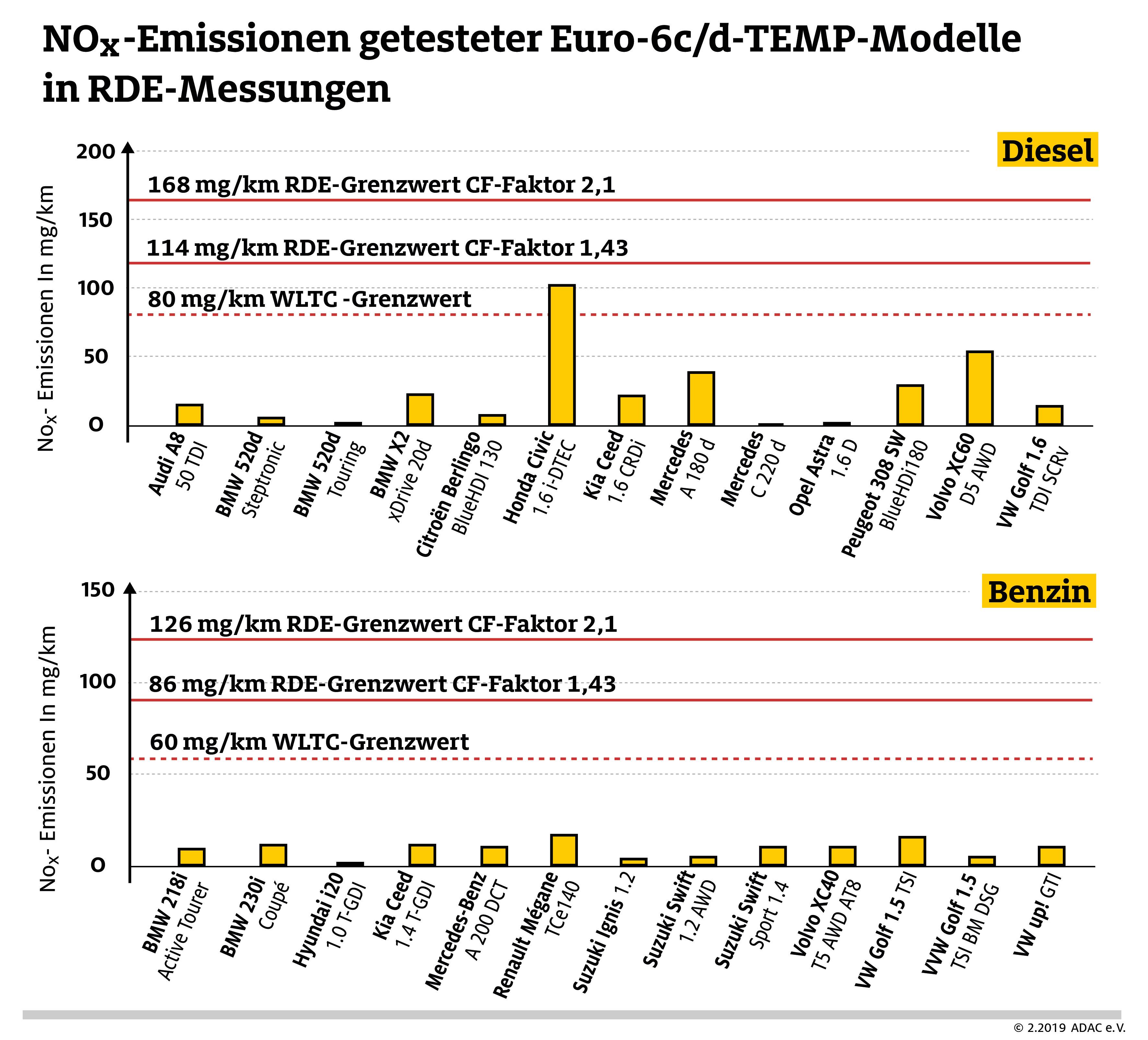 Wer sich heute einen neuen Diesel-Pkw zulegt, muss sich wegen möglicher Überschreitungen der Stickoxid-Grenzwerte keine Sorgen machen: Wie der aktuelle ADAC Ecotest zeigt, erfüllen alle bisher auf der Straße gemessenen Euro 6c- und 6d-Temp-Fahrzeuge weitaus strengere Anforderungen bei den Stickoxiden (NOx) als von der EU vorgeschrieben. Im Test blieben die Autos nicht nur deutlich unter dem Toleranzwert von 168 mg/km für Diesel-Pkw, der im Straßentest (RDE-Verfahren) angewendet wird, sondern auch unter dem aktuellen Euro-6-WLTC-Grenzwert von 80 mg/km. Das Gericht der Europäischen Union EuG hatte im Dezember 2018 nach Klagen der Städte Paris, Brüssel und Madrid die von der EU-Kommission erlassenen Toleranzwerte für die Straßentests für nichtig erklärt.