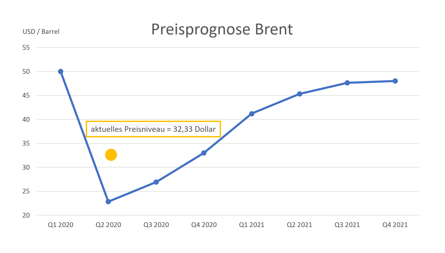Doch mit einem starken Preisanstieg rechnet das US Energieministerium deshalb nicht. Zu stark sind die Nachfrageausfälle auf globaler Ebene, als dass die sinkende Ölproduktion der USA die Ölpreise nachhaltig stützen könnte. Vielmehr rechnet man damit, dass die europäische Rohölsorte Brent im Jahresdurchschnitt 33,04 Dollar pro Barrel kosten wird, was nur geringfügig über dem aktuellen Niveau von 32,33 Dollar liegt.