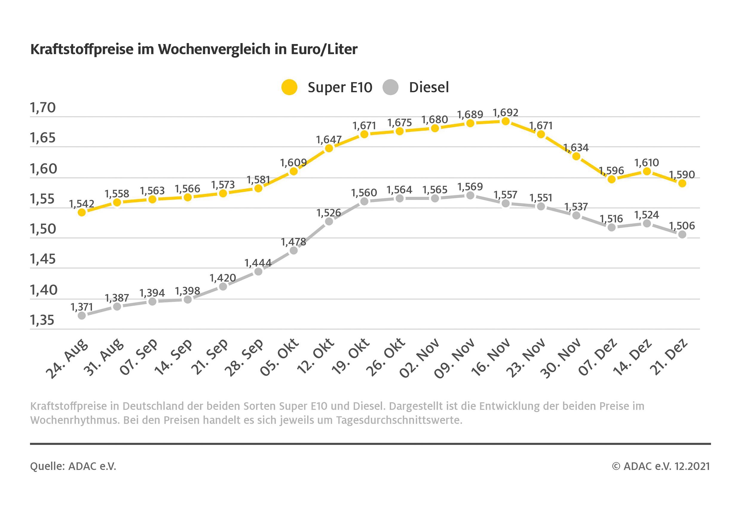 München (ots) – Gemessen am Ölpreis waren die Kraftstoffpreise an den deutschen Tankstellen in den letzten Wochen zu hoch. Mittlerweile lässt sich jedoch eine leichte Entspannung erkennen. Wie die aktuelle ADAC Auswertung der Kraftstoffpreise zeigt, sank der Preis für einen Liter Super E10 im Vergleich zur Vorwoche um zwei Cent und liegt derzeit im bundesweiten Mittel bei 1,590 Euro. Diesel kostet im Schnitt aktuell 1,506 Euro und damit um 1,8 Cent weniger als vor einer Woche.