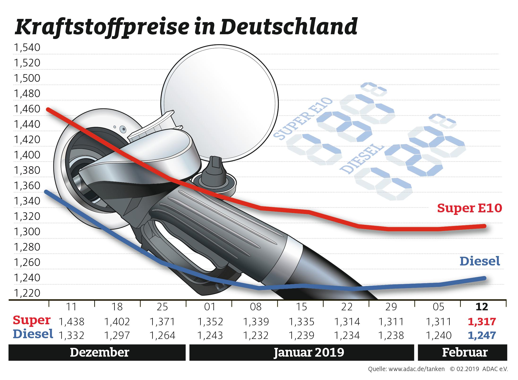 Nachdem sich Autofahrer seit November über sinkende und zuletzt stagnierende Kraftstoffpreise freuen durften, sind diese inzwischen wieder leicht gestiegen. Laut aktueller Auswertung des ADAC kostet ein Liter Super E10 im Bundesdurchschnitt 1,317 Euro und damit 0,6 Cent mehr als in der Vorwoche. Diesel verteuerte sich um 0,7 Cent auf 1,247 Euro pro Liter. Die durchschnittliche Preisspanne zwischen beiden Sorten hat sich noch einmal verringert und beträgt nur noch 7,0 Cent.