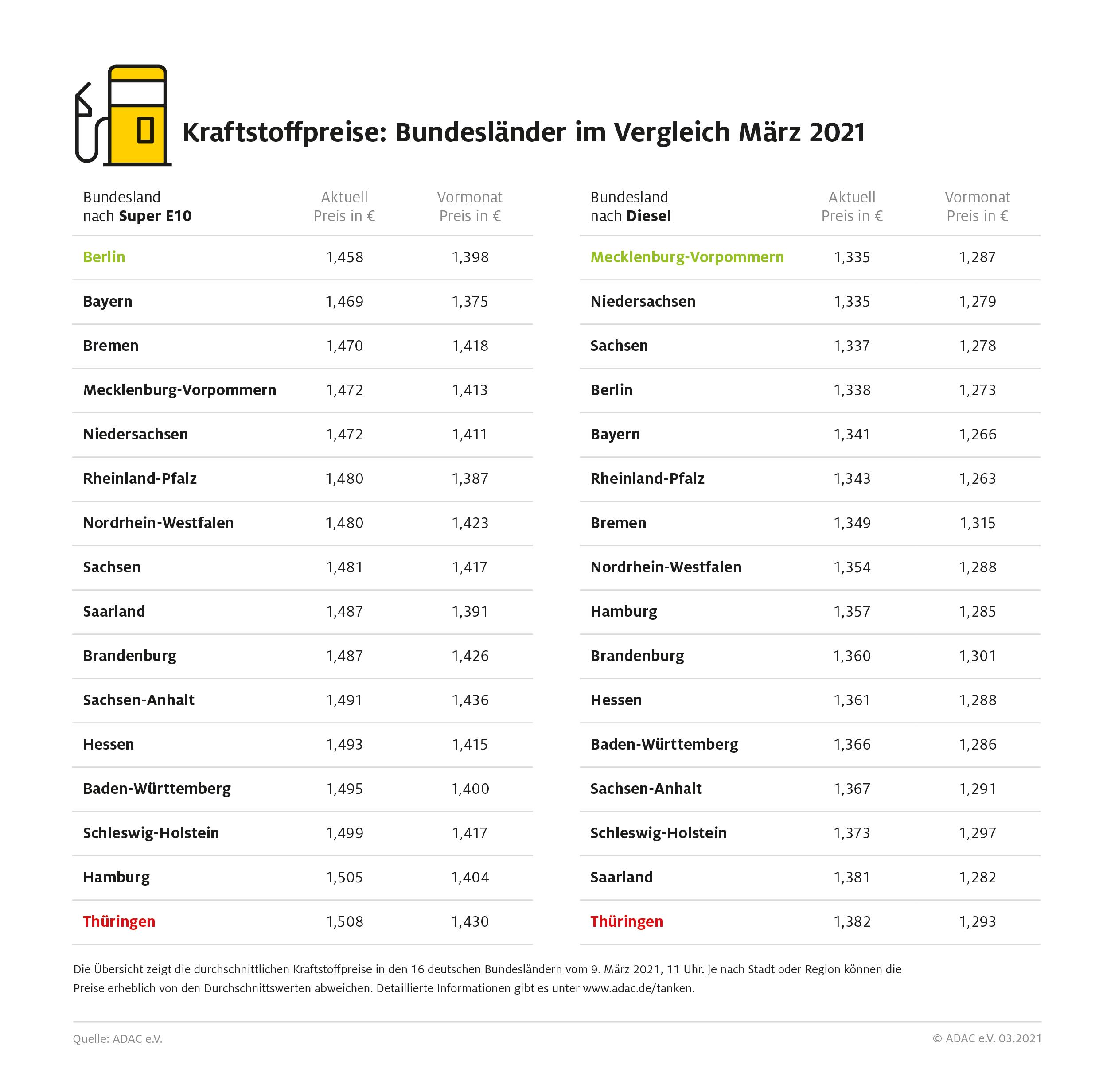 Ein uneinheitliches Bild zeigt sich bei den günstigsten Bundesländern: Benzin ist laut ADAC Auswertung momentan in Berlin am preiswertesten. Ein Liter Super E10 kostet in der Bundeshauptstadt 1,458 Euro, gefolgt von Bayern mit 1,469 Euro und Bremen mit 1,470 Euro. Dieselfahrer tanken in Mecklenburg-Vorpommern und Niedersachsen am preiswertesten. Diese Bundesländer liegen mit einem Durchschnittspreis von 1,335 Euro gleichauf. Dritter ist Sachsen mit 1,337 Euro.